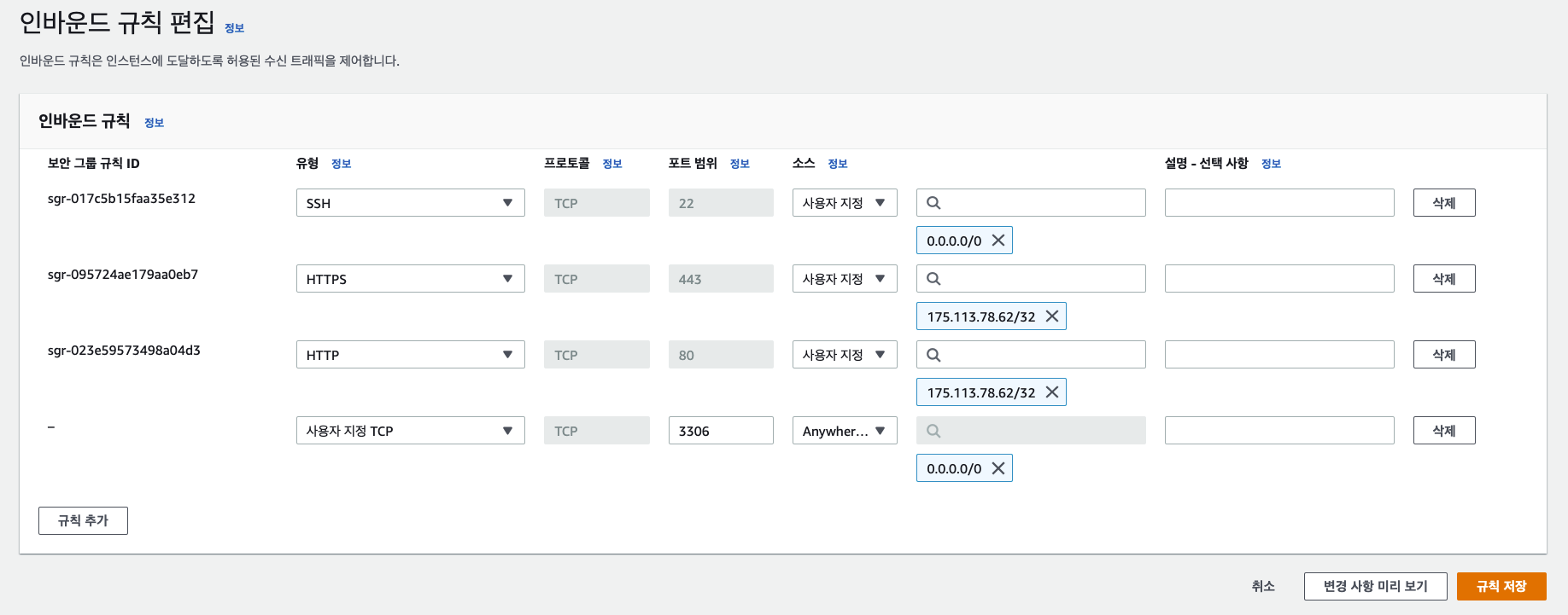4. EC2 보안그룹 편집하기 (인바운드 규칙에 TCP 3306 추가)
