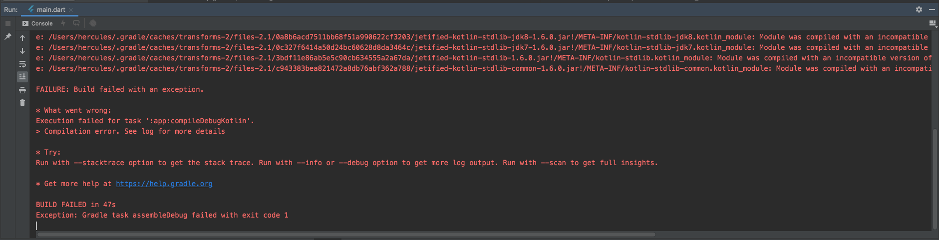 e: /Users/hercules/.gradle/caches/transforms-2/files-2.1/0c327f6414a50d24bc60628d8da3464c/jetified-kotlin-stdlib-jdk7-1.6.0.jar!/META-INF/kotlin-stdlib-jdk7.kotlin_module: Module was compiled with an incompatible version of Kotlin. The binary version of its metadata is 1.6.0, expected version is 1.4.2.
